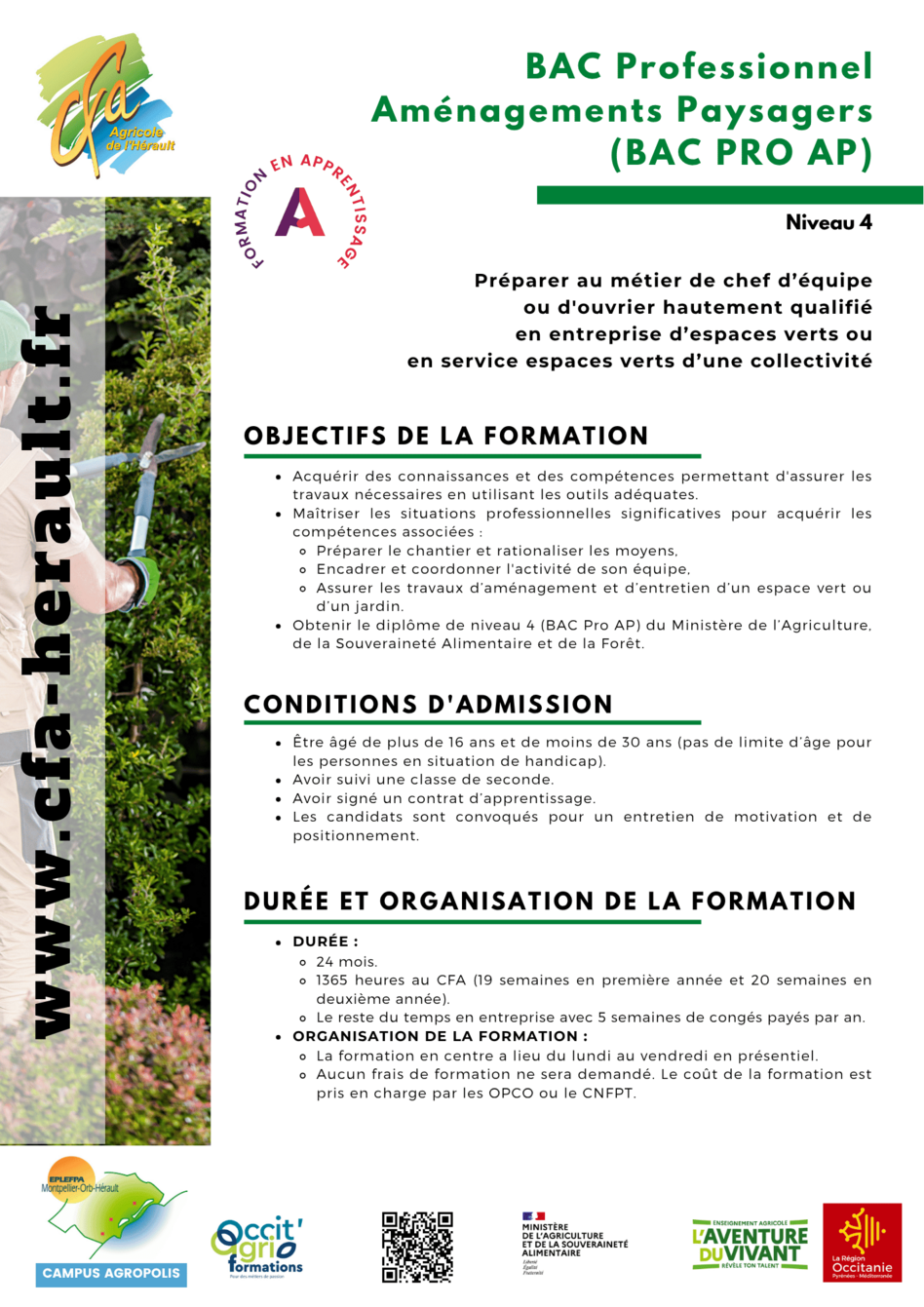 - Obtenir le diplôme de niveau 4 (BAC Pro AP) du Ministère de l’Agriculture, de la Souveraineté Alimentaire et de la Forêt.
