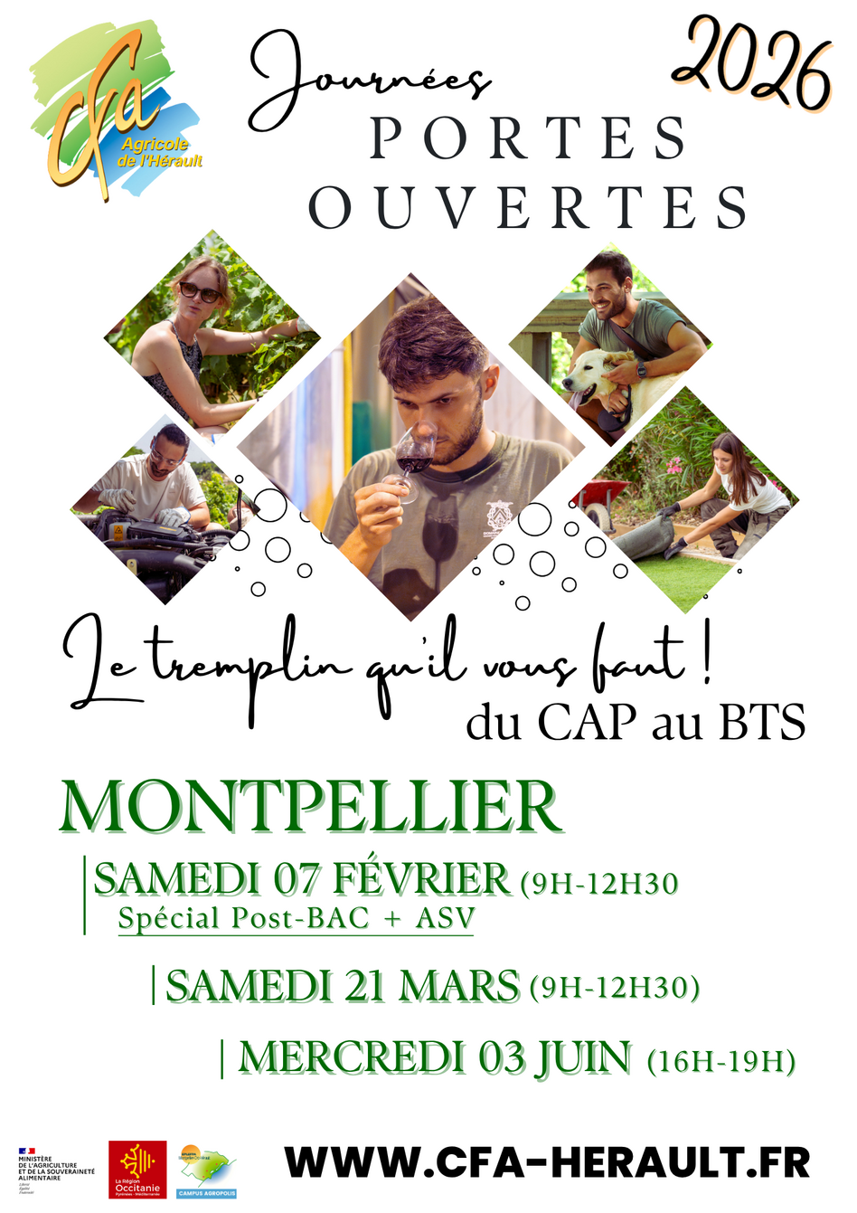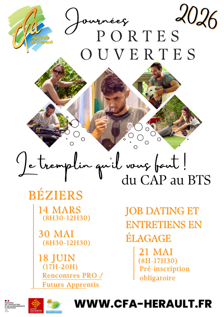 Découvrez nos formations et nos équipes à l'occasion de nos Journées Portes Ouvertes du CFA Agricole de l'Hérault : sites de Béziers et de Montpellier