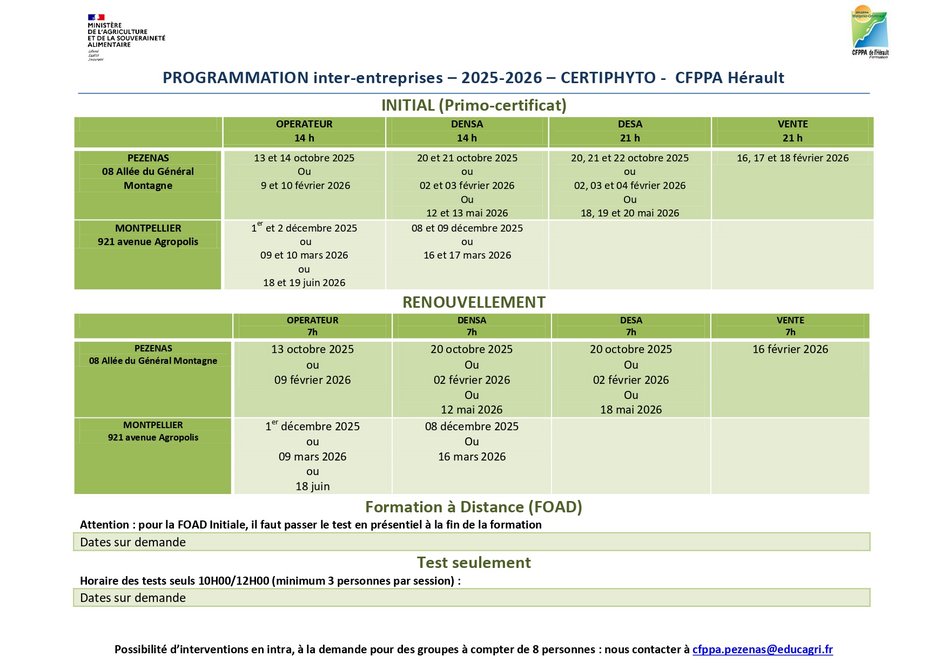 Le CFPPA de l'Hérault propose la formation en présentiel ou distanciel (FOAD) pour les catégories suivantes :