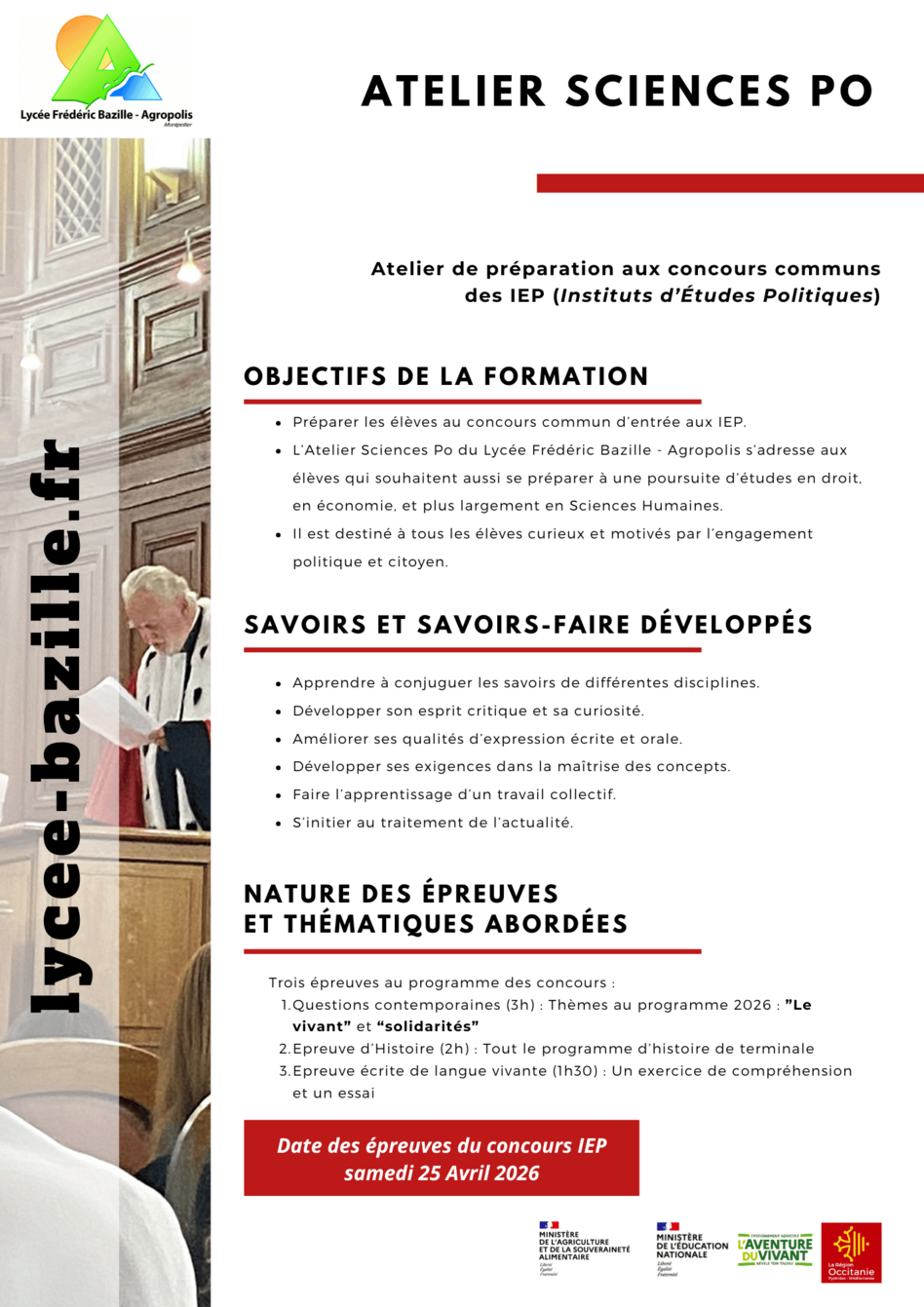 - L’Atelier Sciences Po du Lycée Frédéric Bazille - Agropolis s’adresse aux élèves qui souhaitent aussi se préparer à une poursuite d’études en droit, en économie, et plus largement en Sciences Humaines.