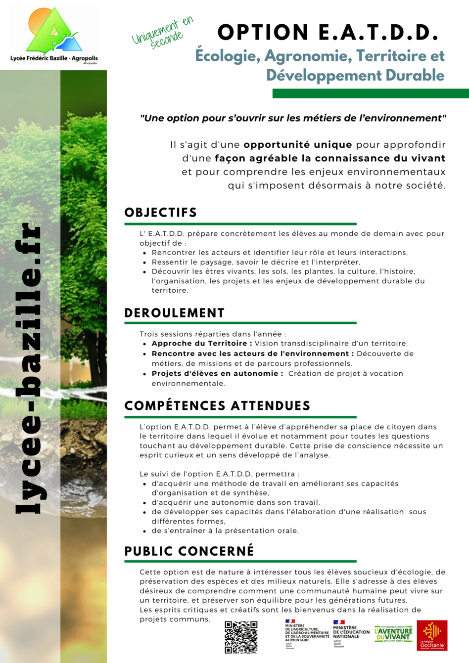 Cet enseignement conduit les élèves à s’immerger dans un territoire particulier pour en découvrir les richesses naturelles, humaines et patrimoniales. Les professeurs de Biologie, d’Agronomie, d'Histoire-Géographie et d’Éducation Socio-Culturelle proposent une découverte pluridisciplinaire et invitent les élèves à s’approprier la spécificité des territoires languedociens choisis par l’équipe pédagogique.