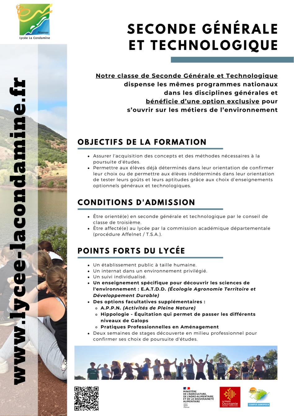 Notre classe de Seconde Générale et Technologique dispense les mêmes programmes nationaux dans les disciplines générales et bénéficie d’une option exclusive pour s’ouvrir sur les métiers de l’environnement.